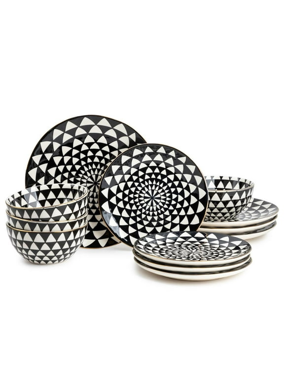 Amazon Com Thyme Table Dinnerware Black White Medallion Stoneware 12 Piece Set Medallion Dinnerware Sets